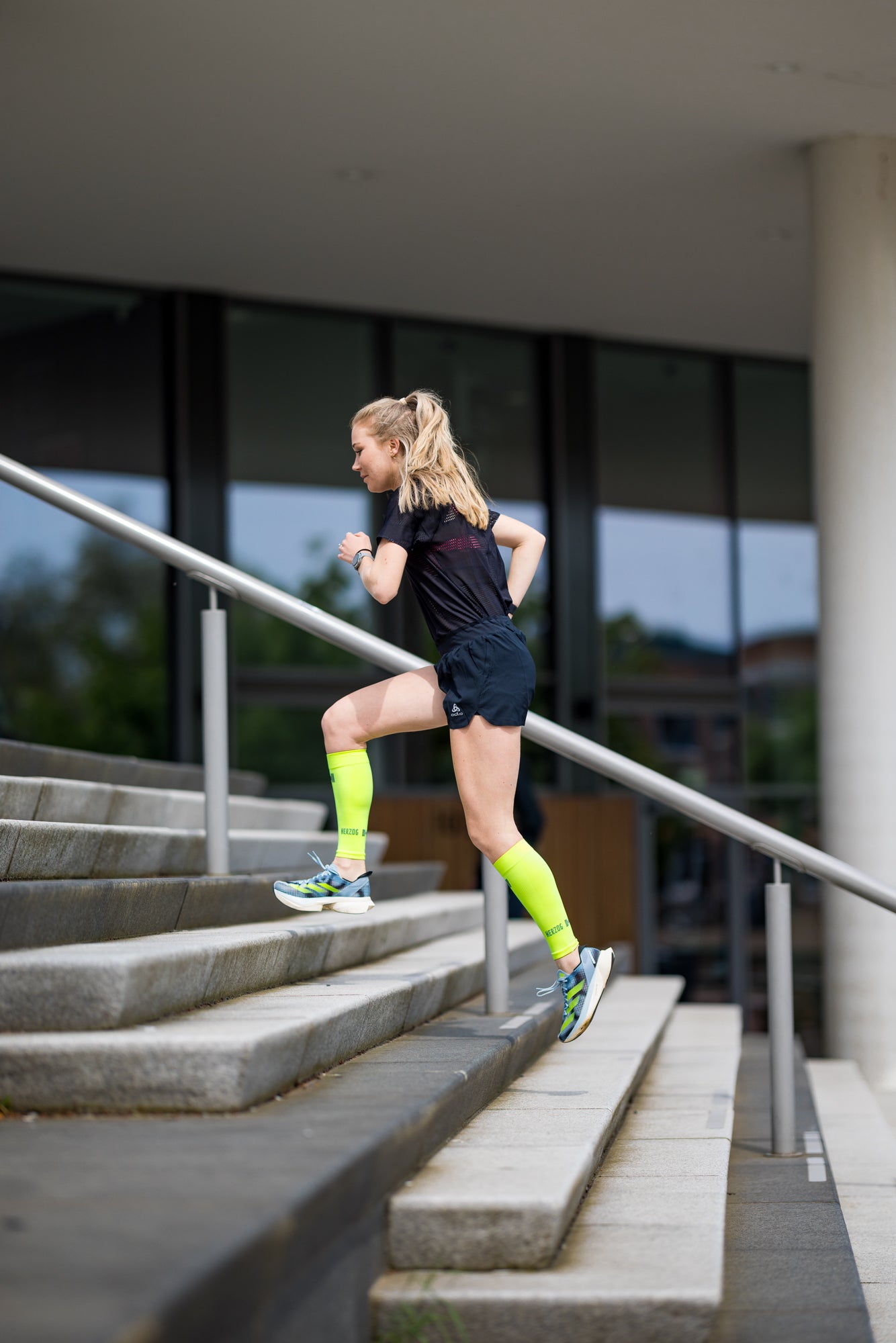 Messen Sie den Umfang 1 cm unterhalb der Kniebeuge. Tipp: Legen Sie zwei Finger in die Kniebeuge, darunter befindet sich der erste Messpunkt.