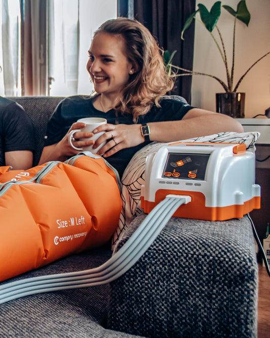 Ein Kompressionsgerät, wie z. B.Compry-Wiederherstellung, arbeitet mit 4 oder 8 Luftkammern, die sich rhythmisch aufblasen und entleeren. Dadurch wird Druck auf die Beine ausgeübt und die Durchblutung angeregt. Dieses Gerät fördert zudem den Abtransport von Abfallprodukten und hilft der Muskulatur, sich schneller zu regenerieren. Ideal nach intensiven Trainingseinheiten oder Wettkämpfen.