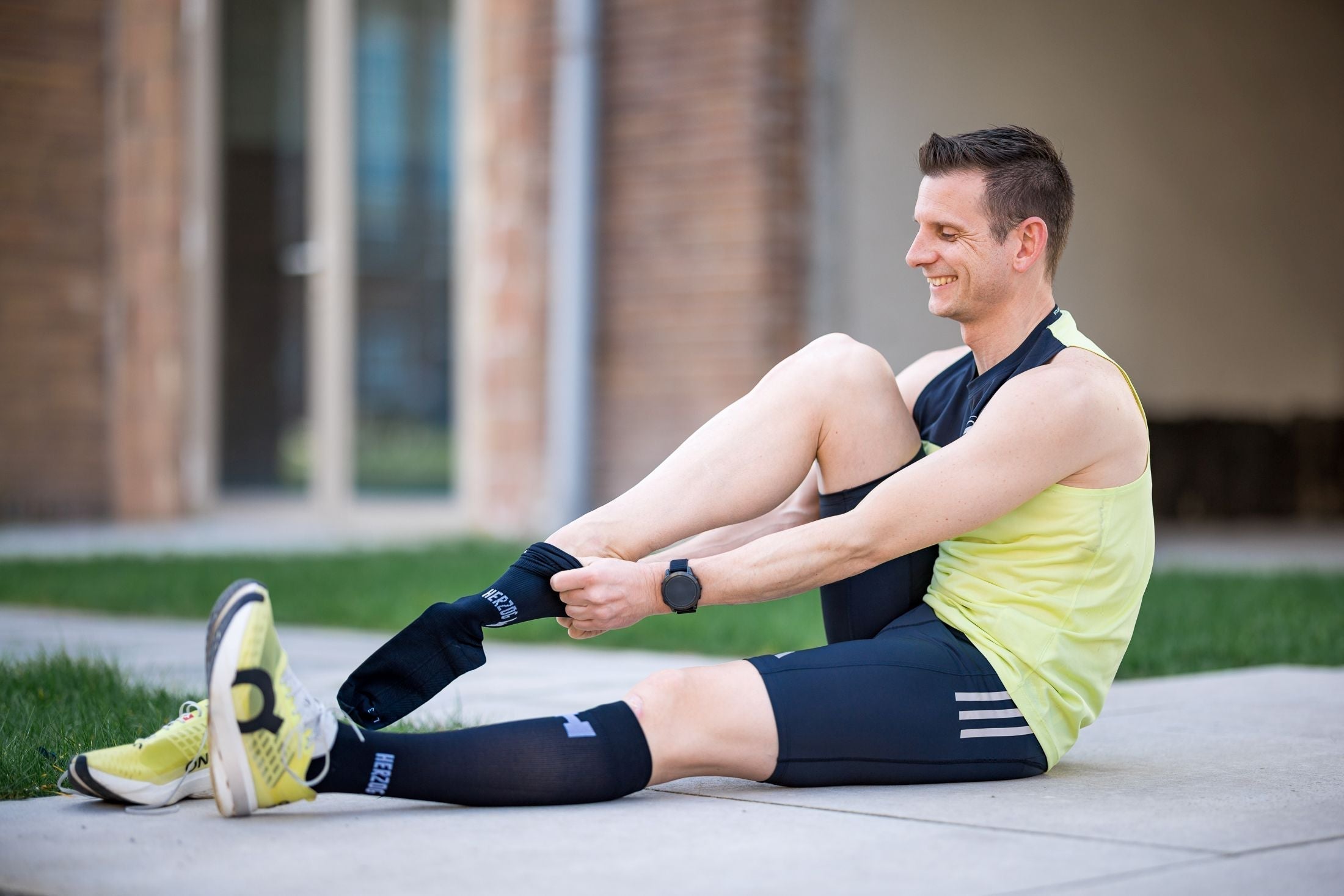 Wear the right clothing: This definitely includes compression socks or tubes. The pressure that the Herzog PRO Compression Socks exert on your lower legs offers several benefits. They improve blood circulation, allowing waste products to be removed more quickly. In addition, the socks have a shock-absorbing effect, which drastically reduces muscle damage.